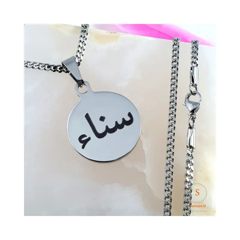 De hanger is gemaakt van Titanium en is daarom heel stevig krast niet snel. Ook bevat deze hanger geen nikkel. Je kan kiezen uit verschillende kleuren bijvoorbeeld goud of een zilveren hanger. Wij graveren jouw naam in het Arabisch of datum in de beste kwaliteit in deze mooie hanger. Jij hoeft alleen een naam of datum in te vullen en wij gaan voor je aan de slag.